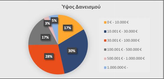 Το ύψος δανειοδότησης της κάθε επιχείρησης αλλά και η μορφή διαφέρει. Σύμφωνα με την επεξεργασία των στοιχείων, το 75% των ερωτηθέντων έχουν χαμηλό δανεισμό μέχρι τις 100.000 ευρώ, ενώ μόλις το 8% δηλώνει ότι έχει δανεισμό άνω τα 500.000 ευρώ