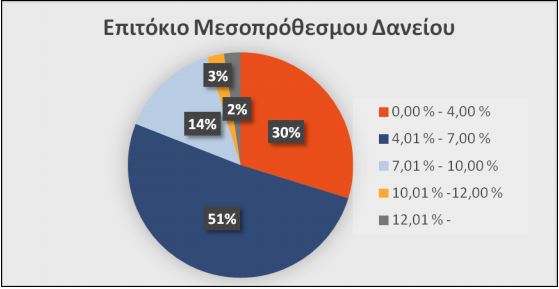 Τα ευρήματα, αναφέρεται στην έρευνα, ταιριάζουν με την κυρίαρχη άποψη ότι τα επιτόκια στα Μεσ/σμα Δάνεια είναι σχετικά χαμηλά. Το 81% των επιχειρήσεων έχει επιτόκιο μικρότερο του 7%.