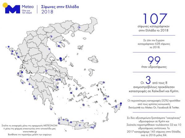 Το 2017 είχαν καταγραφεί 145 σίφωνες στην Ελλάδα, ενώ το 2016 μόνο 84. Σε όλη την Ευρώπη πέρυσι καταγράφηκαν συνολικά 628 σίφωνες. Η πλειονότητα των σιφώνων του 2018 στην χώρα μας (οι 99) ήταν υδροσίφωνες, οι οποίοι δημιουργήθηκαν και παρέμειναν πάνω από θαλάσσιες περιοχές, χωρίς να δημιουργήσουν προβλήματα, ενώ υπήρξαν και οκτώ ανεμοστρόβιλοι (σίφωνες ξηράς). Τόσο ο συνολικός αριθμός των σιφώνων το 2018 στην Ελλάδα, όσο και ο αριθμός των ισχυρών ανεμοστρόβιλων που προκάλεσαν ζημιές, κυμάνθηκαν στο μέσο όρο της τελευταίας δεκαετίας.