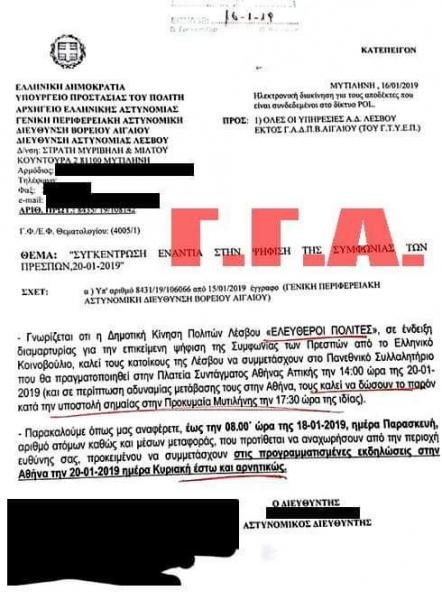Σύμφωνα με υπηρεσιακό έγγραφο με ημερομηνία 16 Ιανουαρίου που δόθηκε στη δημοσιότητα, η Αστυνομική Διεύθυνση της Λέσβου διατάσσει όλες τις υπηρεσίες της να αναφέρουν πόσοι επιβάτες πρόκειται να ταξιδέψουν με πλοίο την Παρασκευή για το Συλλαλητήριο της Αθήνας.