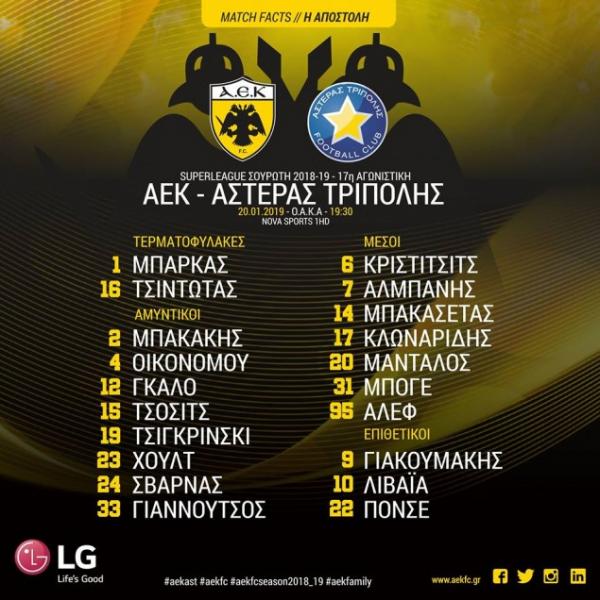Με τον Μάρκο Λιβάγια στη σύνθεσή της θα παραταχθεί η ΑΕΚ στο αυριανό παιχνίδι με τον Αστέρα Τρίπολης στο ΟΑΚΑ, για την 17η αγωνιστική της Σούπερ Λίγκας (20/1, 19:30).