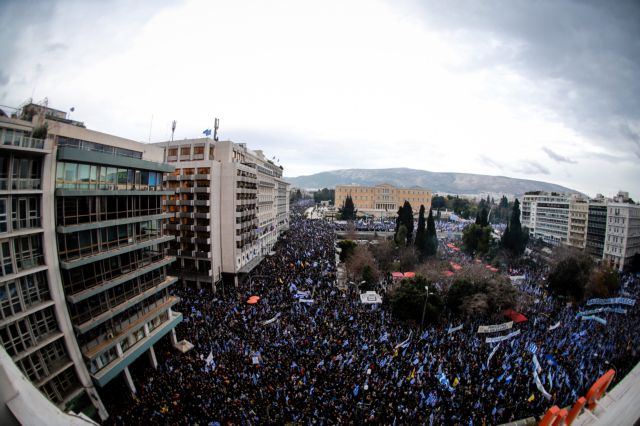 Κοσμοσυρροή στην πλατεία Συντάγματος όπου χιλιάδες πολίτες διαδηλώνουν υπό τη βροχή στο συλλαλητήριο για τη Μακεδονία.