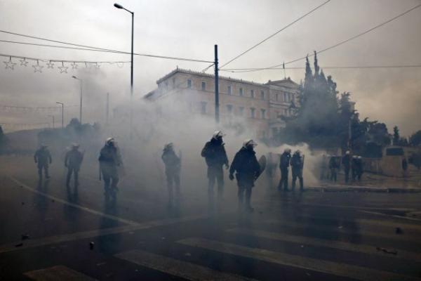 Όλα ξεκίνησαν όταν στις 14:30 ομάδα κουκουλοφόρων επιχείρησε να κάνει ντου στο προαύλιο της Βουλής και επιτέθηκε κατά των ΜΑΤ, τα οποία προχώρησαν σε ρίψη δακρυγόνων μέσα στο πλήθος. Με αφορμή την επίθεση από μία μικρή μερίδα διαδηλωτών, η αστυνομία έκανε χρήση δακρυγόνων, προκαλώντας τη διάσπαση της μεγάλης συγκέντρωσης ακριβώς μπροστά στη Βουλή.