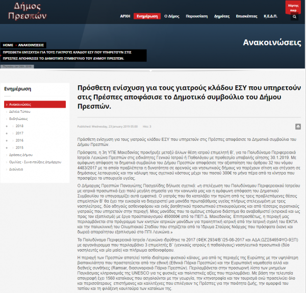 Η προκήρυξη για την πρόσληψη γιατρού για τον δήμο Πρεσπών λήγει στο τέλος Ιανουαρίου και η δημοτική αρχή ελπίζει ότι θα καταφέρει με το μπόνους που προσφέρει να προσελκύσει ενδιαφερόμενους.