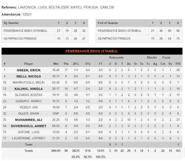 Σπανούλης και Πρίντεζης είχαν μείνει στο μηδέν στο πρώτο μέρος, με τον τελευταίο να ολοκληρώνει άποντος το παιχνίδι. Τον Ολυμπιακό (12-8) «σκότωσε» η περιφέρεια της τουρκικής ομάδας, με τον πρώην «ερυθρόλευκο» Έρικ Γκριν να μετρά 17 πόντους με 4/4 τρίποντα! Ο Νίκολα Κάλινιτς πρόσθεσε 16, ο Μπόμπι Ντίξον 13 και ο Κώστας Σλούκας 12. Τι κι αν ο σέντερ της Φενέρ, Γιαν Βέσελι έμεινε στους 7 και βγήκε με 5 φάουλ, ο Νίκολα Μιλουτίνοβ με 11 πόντους και 4 ριμπάουντ δεν μπόρεσε αυτή τη φορά να κάνει τη διαφορά. Γιάνις Τίμα και Γιάνις Στρέλνιεκς ήταν οι δύο διασωθέντες από τη συντριβή του Ολυμπιακού στην Πόλη με 14 και 13 πόντους αντίστοιχα. Ο Ολυμπιακός προσπαθούσε έξω από τα 6.75 να «χτυπήσει» τη Φενέρ (12/29 τρίποντα), αλλά είχε 11/22 δίποντα έναντι 24/35 των γηπεδούχων!