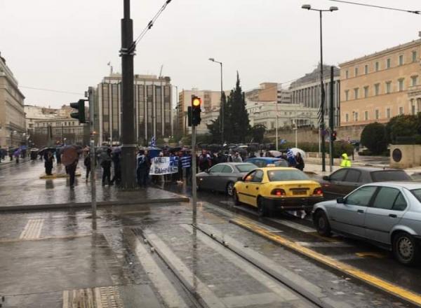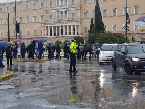 Υπό δυνατή βροχή πραγματοποιείται αυτήν την ώρα στο Σύνταγμα συγκέντρωση κατά της Συμφωνίας των Πρεσπών που ψηφίζεται το μεσημέρι στην Ολομέλεια της Βουλής.