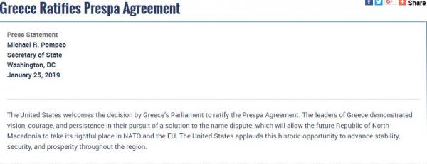 Χαιρετίζει το Στέιτ Ντιπάρτμεντ την κύρωση της Συμφωνίας των Πρεσπών