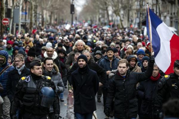 Μερικές χιλιάδες «κόκκινα φουλάρια» συγκεντρώθηκαν σήμερα, υπό βροχή, την Πλας ντε λα Νασιόν στο Παρίσι για «να υπερασπιστούν τη δημοκρατία και τους θεσμούς» απέναντι στη βία που σημάδεψε τις κινητοποιήσεις των «κίτρινων γιλέκων» τις τελευταίες εβδομάδες.