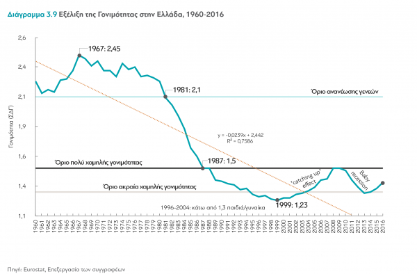 Το 2016 ο δείκτης γονιμότητας στη χώρα μας ήταν 1,38, ένας από τους χαμηλότερους παγκοσμίως. Με βάση αυτά τα στοιχεία, υπολογίζεται πως -με βάση το μεσαίο σενάριο- το 2050 οι Έλληνες θα είμαστε λιγότεροι (8,8 εκατομμύρια) και γηραιότεροι (το 1/3 του πληθυσμού θα είναι άνω των 65 ετών, έναντι 1/5 σήμερα).