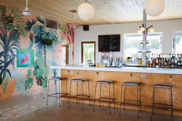 Πίνακες ξυλείας χρησιμοποιούνται πίσω από τον πάγκο του καφέ, όπου άλλες επιφάνειες τοίχων είναι διακοσμημένες με μοτίβα τροπικών φύλλων σε ροζ και πράσινο.