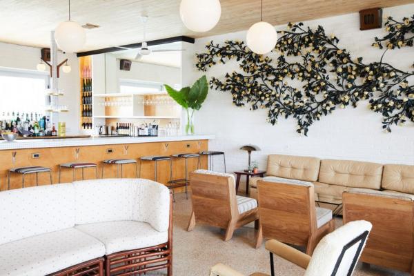 Καλαίσθητες καρέκλες και άνετοι καναπέδες είναι τοποθετημένοι κάτω από λαμπτήρες σε σχήμα σφαίρας κρεμασμένοι από την ξύλινη οροφή, ενώ το φύλλωμα αποκλείει το φως από τα μεγάλα παράθυρα.