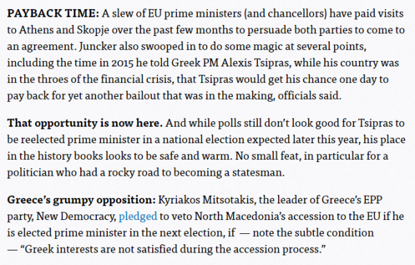 Αναφερόμενος στη Νέα Δημοκρατία, ο συντάκτης επισημαίνει πως «ο Κυριάκος Μητσοτάκης, επικεφαλής της Νέας Δημοκρατίας, που πρεσβεύει τις ιδέες του ΕΛΚ στην Ελλάδα, δεσμεύτηκε να ασκήσει βέτο στην προσχώρηση της Βόρειας Μακεδονίας στην Ευρωπαϊκή Ένωση εάν εκλεγεί πρωθυπουργός στις επόμενες εκλογές, εφόσον – σημειώστε την διακριτική προϋπόθεση – «τα ελληνικά συμφέροντα δεν ικανοποιηθούν κατά τη διαδικασία ένταξης».