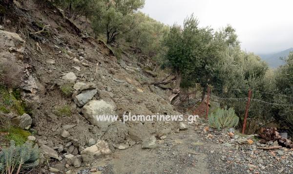 Νέες κατολισθήσεις είχαμε στο Πλωμάρι, αυτή τη φορά στο αγροτικό οδικό δίκτυο και πιο συγκεκριμένα στο δρόμο που οδηγεί στις θέσεις Καφούρα και Μονογενή και προς Άγιος Ελευθέριο, συνέβη η πιο επικίνδυνη, αλλά και μικρότερες σε άλλα σημεία. Εκεί ο δρόμος έκλεισε από πτώσεις βράχων, ελαιοδένδρων που ξεριζώθηκαν μαζί με μεγάλη ποσότητα χώματος και λάσπης που υποχώρησε.