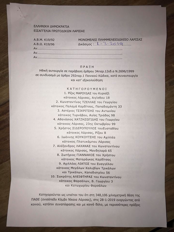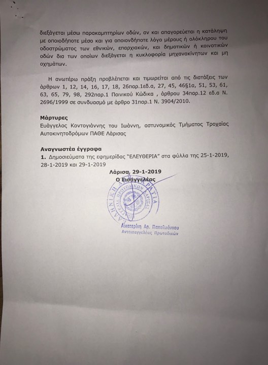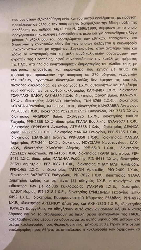 Στο έγγραφο που έφθασε από την Εισαγγελία Πρωτοδικών Λάρισας, διώκονται ήδη 10 αγρότες.