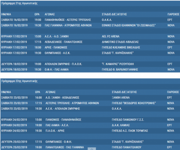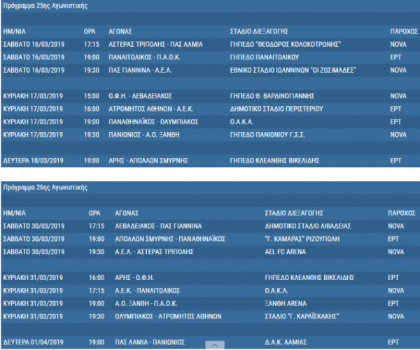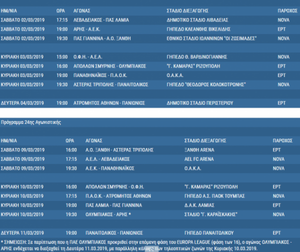 Υπάρχει πάντως ένας αστερίσκος που αφορά τον Ολυμπιακό. Αν οι Ερυθρόλευκοι προκριθούν στους «16» του Europa League (αποκλείοντας την Ντιναμό Κιέβου), τότε ο εντός έδρας αγώνας τους με τον Άρη που έχει οριστεί για την Κυριακή 10 Μαρτίου (19:30) πιθανότατα θα μετατεθεί για τη Δευτέρα 11/3 «με παράλληλη κάλυψη των τηλεοπτικών ζωνών της Κυριακής» όπως σημειώνεται.