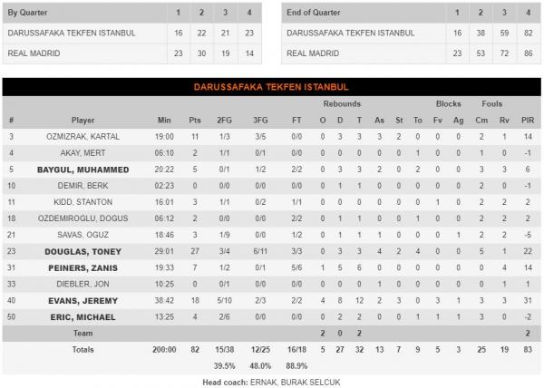 Πολύ μεγάλο ματς στην Κωνσταντινούπολη όπου η εκ των ουραγών Νταρουσάφακα, υποδέχτηκε τη Ρεάλ Μαδρίτης στην Volkswagen Arena. Το ματς έδειχνε πως θα εξελιχθεί σε περίπατο για τους φιλοξενούμενους που έβρισκαν εύκολα τη λύση προς τη ρακέτα των Τούρκων, την ώρα που η άμυνα των Μαδριλένων δούλευε σωστά για το υπέρ τους +15 (53-28).