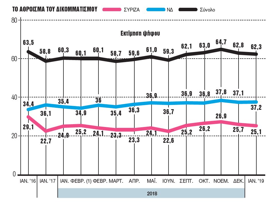Η προεκλογική περίοδος αναπτύσσει πάντα τη δική της δυναμική. Ωστόσο αν προσμετρηθεί στην παράσταση νίκης – ένα ευαίσθητο δημοσκοπικό μέγεθος, το οποίο παρέμεινε ακίνητο όλο το 2018 με τη ΝΔ να προηγείται σταθερά του ΣΥΡΙΖΑ – το άθροισμα του δικομματισμού που διατηρείται πάνω-κάτω στο 63%, πιθανολογείται ότι δύσκολα θα υπάρξουν θεαματικές ανατροπές στον διαμορφούμενο συσχετισμό δυνάμεων.