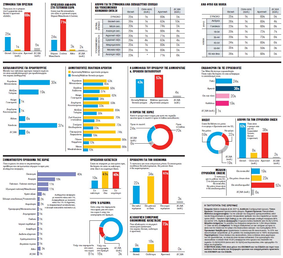 Σε ό,τι αφορά το Μακεδονικό, η συντριπτική πλειονότητα της κοινής γνώμης (69%) θεωρεί αρνητική εξέλιξη την επικύρωση της Συμφωνίας των Πρεσπών. Ωστόσο, ο χειρισμός του θέματος από τον ΣΥΡΙΖΑ και τη Νέα Δημοκρατία οδηγεί σε ανησυχητικές παρατηρήσεις. Η στρατηγική της πόλωσης, την οποία επέλεξε η κυβέρνηση συμπαρασύροντας και την αξιωματική αντιπολίτευση, ενίσχυσε τελικώς τα άκρα. Οι αντισυστημικές δυνάμεις ανέβηκαν συνολικά πάνω από 5% μέσα σε έναν μήνα. Η Χρυσή Αυγή παρουσιάζει σημαντική άνοδο, μάλιστα σε ορισμένες περιοχές της Μακεδονίας έχει διψήφιο ποσοστό, προσελκύει κυρίως άνδρες, ηλικίας 17-34 ετών, και έχει μεγαλύτερη διείσδυση στους γεωργούς, οι οποίοι δείχνουν εξαιρετικά χαμηλή εμπιστοσύνη στο πολιτικό σύστημα. Οι άνεργοι αντιθέτως κατευθύνονται προς το ΚΚΕ, το οποίο διατηρεί τις δυνάμεις του.