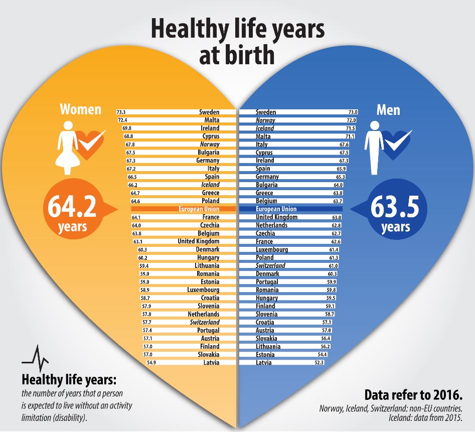 Ο μέσος ευρωπαϊκός όρος βρίσκεται στα 63,5 έτη υγιούς ζωής για τους άνδρες και στα 64,2 έτη για τις γυναίκες.