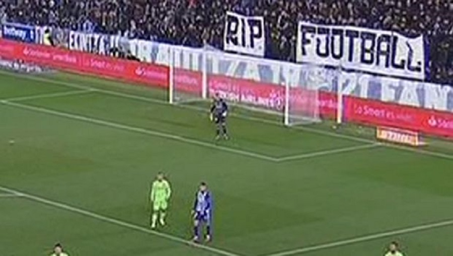Πανό που έγραφε RIP Football (αναπαύσου εν ειρήνη, ποδόσφαιρο) κάνοντας δηλαδή μια εικονική κηδεία στο άθλημα, με σκοπό να διαμαρτυρηθούν για την απόφαση της ισπανικής ομοσπονδίας να ορίζει αγώνες τις Δευτέρες.