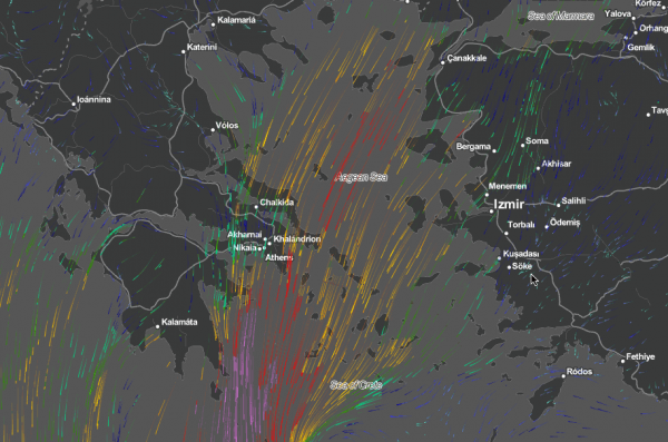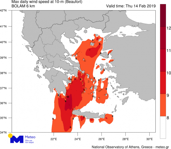 Στο Σχήμα 1 μπορείτε να δείτε την αναμενόμενη πνοή των ανέμων τις πρώτες ώρες της Πέμπτης 14/02, όπου με μωβ χρώμα παρουσιάζονται οι περιοχές όπου η ισχύς τους θα φτάσει τα 10 μποφόρ (δείτε λεπτομερείς χάρτες στο ανεμολόγιό μας).