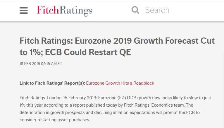 Ο οίκος αξιολόγησης Fitch βλέπει ανάπτυξη μόλις 1% για το 2019, και θεωρεί πως η σημαντική επιβράδυνση της οικονομίας της ευρωζώνης δημιουργεί τις προϋποθέσεις για νέα μέτρα νομισματικής τόνωσης από την ΕΚΤ