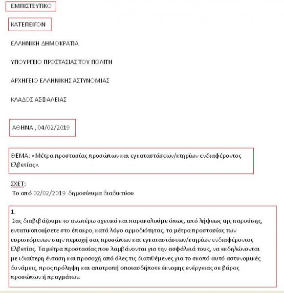 Η ΕΛΑΣ είχε αποστείλει στις 4 Φεβρουαρίου «κατεπείγον-εμπιστευτικό» εγγραφο για επίθεση στην πρεσβεία της Ελβετίας. Ζήτηθηκαν εκτακτα μέτρα φρούρησης που δεν εφαρμόσθηκαν. Νέο δείγμα διάλυσης της ΕΛΑΣ