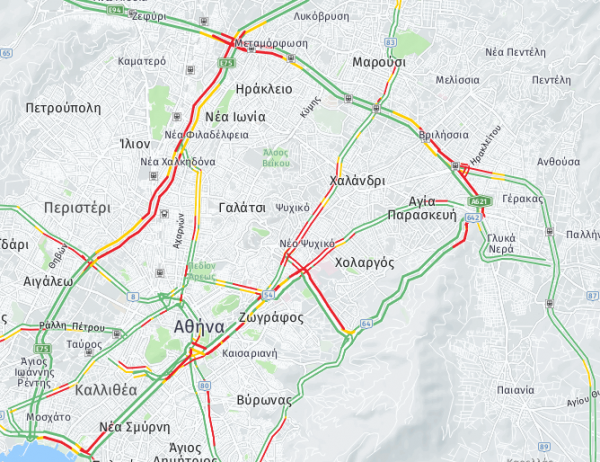 Τα πιο σημαντικά προβλήματα εντοπίζονται στην Αττική Οδό στο ρεύμα προς Ελευσίνα, από την Πεντέλη προς Κηφισίας, στην έξοδο για Λαμία, στον περιφερειακό Υμηττού, από Αγία Παρασκευή προς Κηφισίας και στο ρεύμα προς Αεροδρόμιο, στον κόμβο Μεταμόρφωσης μέχρι και την Ηρακλείου.
