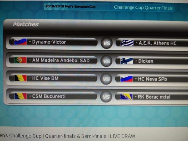 Τη Ντιναμό Βίκτορ έβγαλε η κληρωτίδα ως αντίπαλο της ΑΕΚ για τα προημιτελικά του Challenge Cup στο χάντμπολ. Η Ένωση θα ταξιδέψει για το πρώτο παιχνίδι στη Ρωσία, ενώ η ρεβάνς θα βρει ως οικοδεσπότες του «κιτρινόμαυρους».