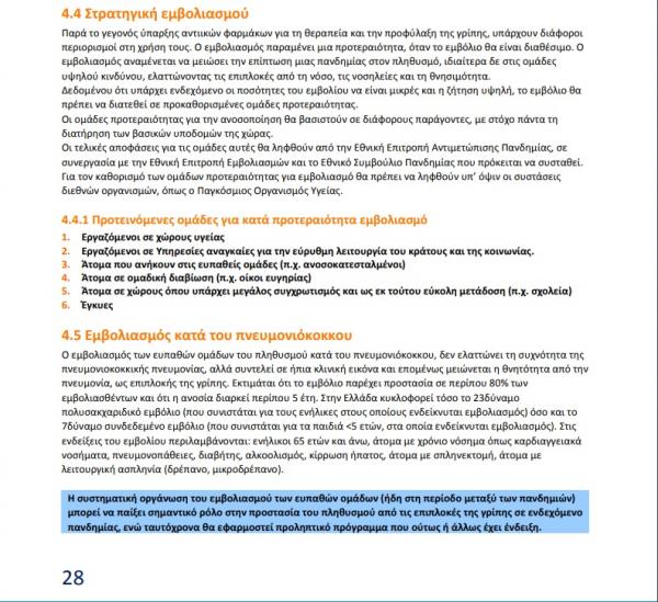 Η συστηματική οργάνωση του εμβολιασμού των ευπαθών ομάδων (ήδη στη περίοδο μεταξύ των πανδημιών) μπορεί να παίξει σημαντικό ρόλο στην προστασία του πληθυσμού από τις επιπλοκές της γρίπης σε ενδεχόμενο πανδημίας, ενώ ταυτόχρονα θα εφαρμοστεί προληπτικό πρόγραμμα που ούτως ή άλλως έχει ενδειξη».