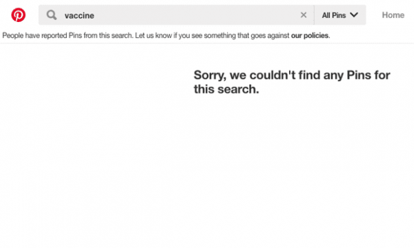 Στον αντίποδα, βρίσκεται στο Pinterest, το οποίο έχει βάλει το λήμμα «vaccines» στη «μαύρη λίστα» των αναζητήσεων, με αποτέλεσμα να εμφανίζεται απλώς ένα κενό.