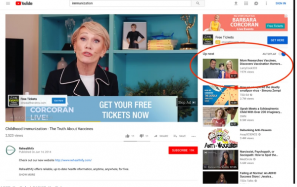 Αλλά η πρώτη πρόταση του YouTube μετά από αυτό το βίντεο ήταν ένα βίντεο κατά του εμβολιασμού που ονομάζεται «Μητέρες ερευνούν τα εμβόλια, ανακαλύπτουν τη φρίκη του εμβολιασμού και σταματούν τη χρήση του» από το κανάλι του Larry Cook, που πρόκειται για τον ιδιοκτήτη του δημοφιλούς ιστότοπου κατά του εμβολιασμού StopMandatoryVaccination.com.