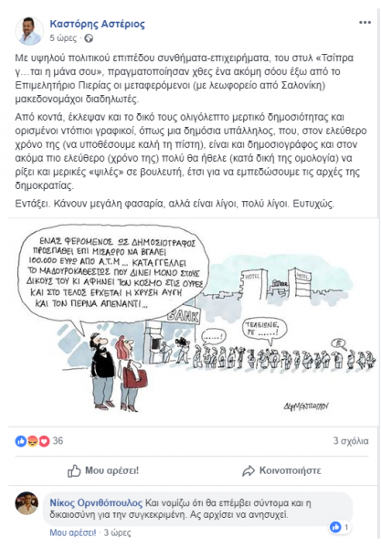 Μια προειδοποίηση που αναρτήθηκε ως σχόλιο σε αναφορά του, επίσης βουλευτή του ΣΥΡΙΖΑ, Αστέριου Καστόρη ο οποίος έκανε λόγο για «μεταφερόμενους μακεδονομάχους» και για μια «δημόσια υπάλληλο που στον ελεύθερο χρόνο της είναι και δημοσιογράφος»…
