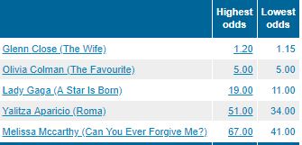 Στην κατηγορία του Πρώτου Γυναικείου Ρόλου, το μεγάλο φαβορί ακούει στο όνομα Γκλεν Γκλόουζ, της ταινίας «Η Σύζυγος». Ωστόσο από κοντά βρίσκεται και η πρωταγωνίστρια του Λάνθιμου Ολίβια Κόλμαν, που κάνει την ερμηνεία της ζωής της.