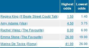 Όσον αφορά στον Δεύτερο Γυναικείο Ρόλο, καμία από τις πρωταγωνίστριες του Λάνθιμου, Ρέιτσελ Βάις και Έμα Στόουν, δεν δείχνουν ικανές να στερήσουν το αγαλματίδιο από την Ρετζίνα Κινγκ του «If Beale Street Could Talk», ενώ υπάρχει πάντα και η Έιμι Άνταμς του «Vice» η οποία είναι δεύτερο φαβορί.