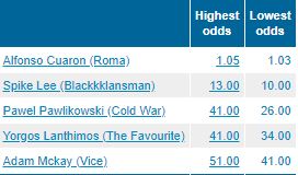 Στην κατηγορία τις Καλύτερης Σκηνοθεσίας, ο Αλφόνσο Κουαρόν δείχνει πως… έχει ήδη κατακτήσει το αγαλματίδιο. Η απόσταση από τον δεύτερο Σπάικ Λι είναι μεγάλη και αν μπορεί να γίνει η έκπληξη αυτή θα έρθει μόνο από τον Λάνθιμο ή τον Πάβελ Παβλικόφσκι με τον «Ψυχρό Πόλεμο». Ωστόσο, ο Κουαρόν δύσκολα θα χάσει…