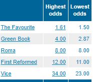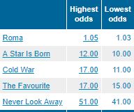 Όσον αφορά το «Ρόμα» είναι λογικό να θεωρείται φαβορί, αφού έχει λάβει και το Χρυσό Λέοντα, στο Φεστιβάλ Βενετίας, αλλά πριν λίγες ημέρες και τα δυο κορυφαία βραβεία BAFTA για την καλύτερη ταινία και σκηνοθεσία.