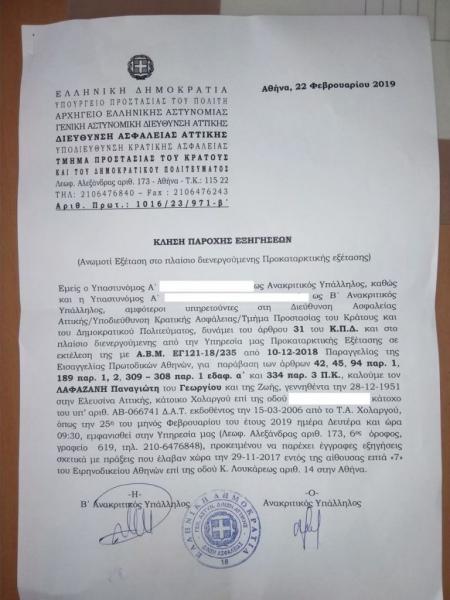 Τον κάλεσε να προσέλθει την Δευτέρα 25 Φεβρουαρίου, στον 6ο όροφο της ΓΑΔΑ, στο περιβόητο Τμήμα Προστασίας του Κράτους και του Δημοκρατικού Πολιτεύματος, προκειμένου να δώσει εξηγήσεις για τις πράξεις του, στα γεγονότα της 29ης Νοεμβρίου 2017, στο Ειρηνοδικείο Αθηνών (όταν τα ΜΑΤ χτύπησαν ανελέητα τους αγωνιστές ενάντια στους πλειστηριασμούς και έριξαν χημικά σε κλειστό χώρο, θέτοντας σε κίνδυνο ακόμη και ανθρώπινες ζωές).