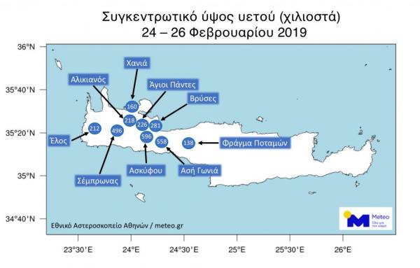 Ένα πανευρωπαϊκό ρεκόρ βροχόπτωσης έσπασε λόγω της «Χιόνης» και της «Ωκεανίδας». Ο αθροιστικός υετός που κατέγραψε ο μετεωρολογικός σταθμός του Εθνικού Αστεροσκοπείου Αθηνών / meteo.gr, που βρίσκεται στο οροπέδιο Ασκύφου Χανίων, από την 1η Φεβρουαρίου έως και το πρωί της Δευτέρας 25/2 έφτασε στα 1.202 χιλιοστά. Το προηγούμενο ρεκόρ μηνιαίου υετού σε κατοικημένη περιοχή ανήκε στο Γκρεντάλεν της Νορβηγίας με 1.190 χιλιοστά, ρεκόρ που κρατούσε από το 1989.
