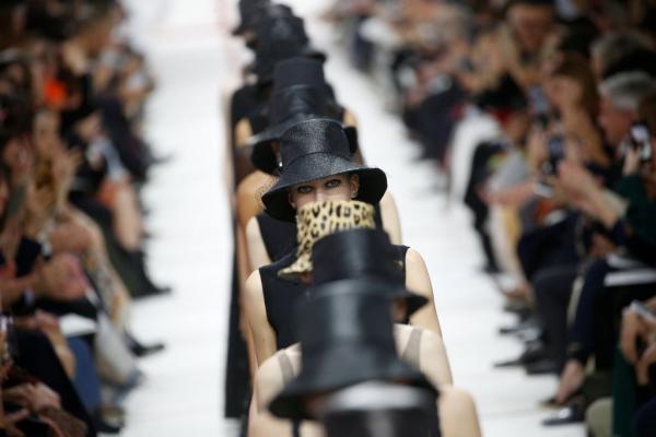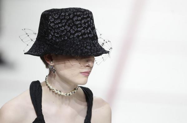 Εφαρμοστές μπλούζες που δένουν με φιόγκο στον λαιμό συνδυάζονται με γκρι φαρδιές μίντι φούστες από ανδρικό ύφασμα για κοστούμι, φαρδιές μαύρες ζώνες εφαρμόζουν στη μέση, παπούτσια μυτερά μπροστά και με τακουνάκι kitten heel ή μαύρα σκαρπίνια φοριούνται με κοντές κάλτσες και καπέλα bucket, με το καρό να κυριαρχεί: η κολεξιόν που παρουσιάστηκε χθες βράδυ στο Παρίσι ήταν ακαταμάχητα ρετρό και εγγλέζικη.