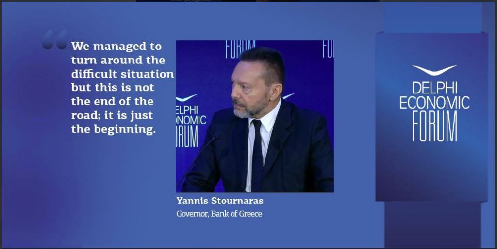 «Καταφέραμε να 'γυρίσουμε' μια δύσκολη κατάσταση, αλλά αυτό δεν είναι το τέλος του δρόμου, είναι μόνο η αρχή» τόνισε ο διοικητής της Τράπεζας της Ελλάδος, Γιάννης Στουρνάρας, στο 4ο Οικονομικό Φόρουμ των Δελφών. Σε αυτήν την κρίση οι τράπεζες είναι στα θύματα τόνισε, ζητώντας συστημικές προσπάθειες για τη μείωση των κόκκινων δανείων.