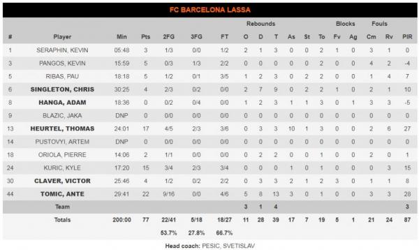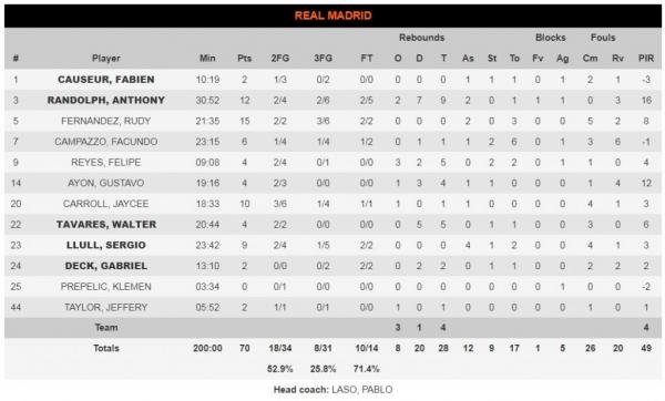 Πολύ καλοί από τη Μπαρτσελόνα οι Τόμιτς (22π., 13ρ), Ερτέλ (17π, 10ας) και Κούριτς (15π.), ενώ από τη Ρεάλ που είχε πολλούς υστερήσαντες προσπάθησαν οι Φερνάντεθ (15π.) και Ράντολφ (12π.).