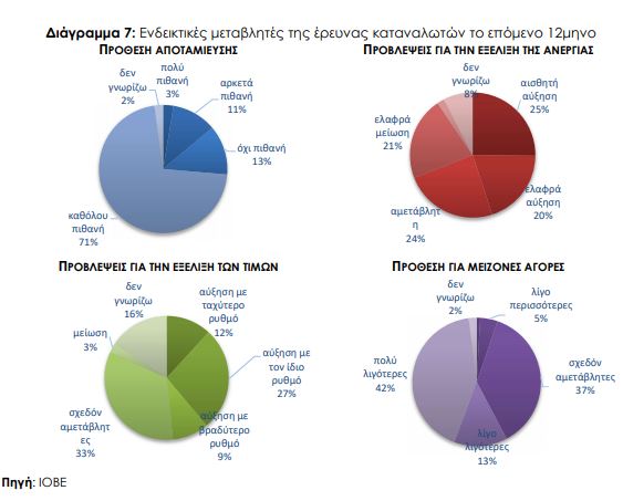 – στην Καταναλωτική Εμπιστοσύνη, οι προβλέψεις των νοικοκυριών για την οικονομική κατάσταση της χώρας επιδεινώνονται, όπως επίσης και οι προβλέψεις για τη δική τους οικονομική κατάσταση και για την ανεργία. Σχεδόν αμετάβλητη παραμένει, ωστόσο, η πρόθεση για αποταμίευση.