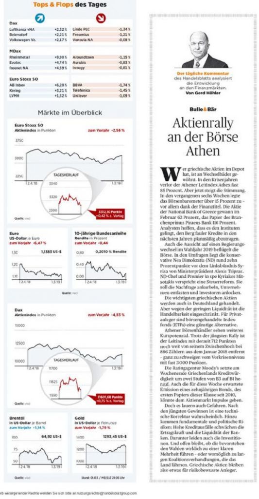 Στη συνέχεια, ο συντάκτης Gerd Höhler, σημειώνει ότι υπάρχει «ράλι μετοχών στο χρηματιστήριο Αθηνών», ενώ αναφέρει ότι «οι χρηματιστές στην Αθήνα πιστεύουν ότι το κλίμα μπορεί να βελτιωθεί περαιτέρω. Εξάλλου η Moody’s αναβάθμισε το αξιόχρεο της Ελλάδας κατά δύο βαθμίδες. Αλλά και η αναμενόμενη εντός της εβδομάδας έκδοση δεκαετούς ομολόγου αναμένεται να δώσει νέα ώθηση στην χρηματιστηριακή αγορά».