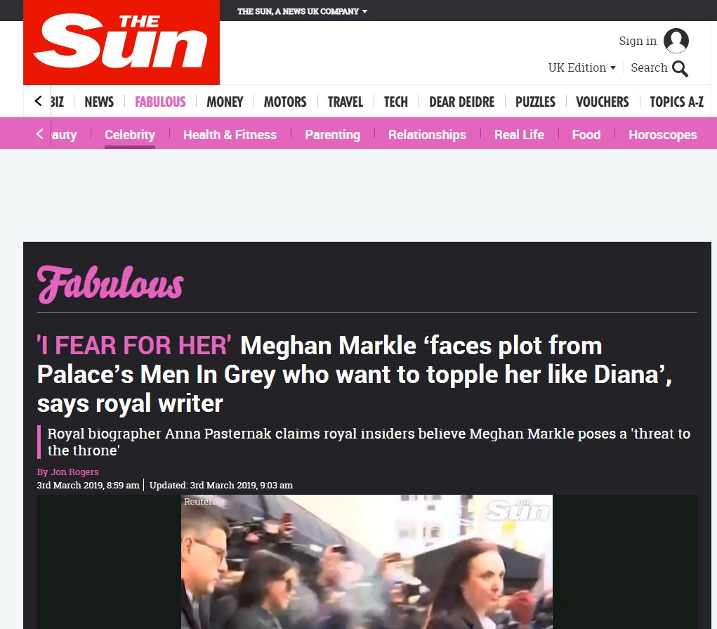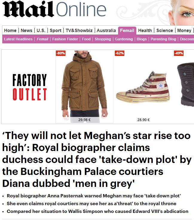 Μάλιστα, το πάει ένα βήμα παρακάτω, λέγοντας πως «οι άνδρες με τα γκρίζα» του Μπάκιγχαμ, όπως συνήθιζε να αποκαλεί η πριγκίπισσα Νταϊάνα τους σύμβουλους του παλατιού, σχεδιάζουν την «πτώση» της δούκισσας του Σάσεξ, επειδή την θεωρούν απειλή για τον θρόνο. Μάλιστα, αποκαλεί τη Μέγκαν Μαρκλ μια «χειροβομβίδα που έχει πέσει επάνω σε ένα ξεπερασμένο σύστημα και που ήδη οι εκρήξεις έχουν αρχίσει και αναμένεται να συνεχιστούν».