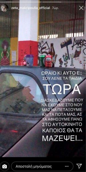Η Ζέτα Μακρυπούλια έγραψε χαρακτηριστικά: «Ωραίο και αυτό ε; Σου λένε τα παιδιά τώρα διασκεδάζουμε που να έχουμε στο νου μας να πετάξουμε και τα ποτά μας, ας τα αφήσουμε πάνω στο αυτοκίνητο. Κάποιος θα τα μαζέψει…».