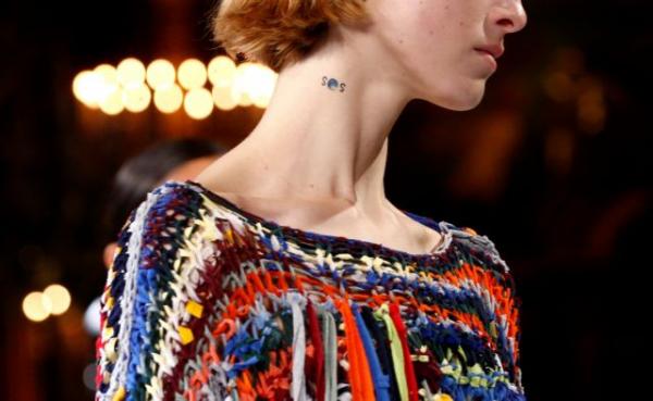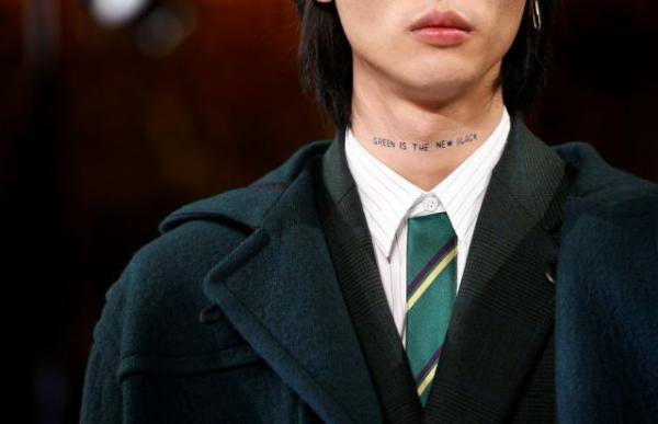 Το μοντέλο είχε ζωγραφίσει στο πλαίσιο της επίδειξης ένα τατουάζ με τη λέξη «SOS» στο ένα της ζυγωματικό. Άλλα μοντέλα είχαν τατουάζ με συνθήματα όπως «Green is the new black».