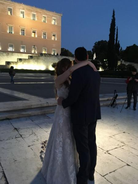 Βράδυ Τετάρτης 6 Μαρτίου και στο Σύνταγμα δεν έχει πολύ κόσμο. Τουρίστες μόνο που φωτογραφίζουν την αλλαγή στην Προεδρική Φρουρά. Ομως, μια έκπληξη περιμένει τους περαστικούς καθώς βλέπουν ένα ζευγάρι μπροστά από το κτίριο της Βουλής, να αγκαλιάζεται και να φιλιέται. Ηταν μάλιστα ντυμένοι… γαμπρός και νύψη και το όλο σκηνικό ήταν ρομαντικό.