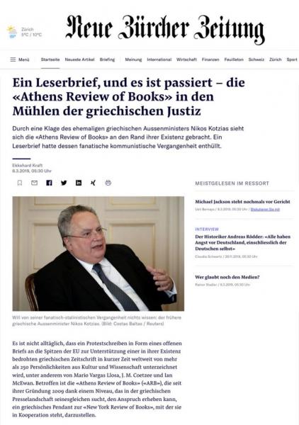 Νέο δημοσίευμα σε μέσο του εξωτερικού που αφορά στην πρωτοφανή δίωξη της «Athens Review of Books» μετά από αγωγή του πρώην υπουργού Εξωτερικών Νίκου Κοτζιά, έρχεται στο φως. Συγκεκριμένα, πρόκειται για άρθρο της ελβετικής εφημερίδας Neue Zürcher Zeitung η οποία αναφέρει ότι το περιοδικό οδηγήθηκε στα ακραία όρια της ύπαρξής του, περιγράφοντας πως η αγωγή του Ν. Κοτζιά κατά της ARB για δυσφήμιση προκάλεσε τον οικονομικό στραγγαλισμό της.