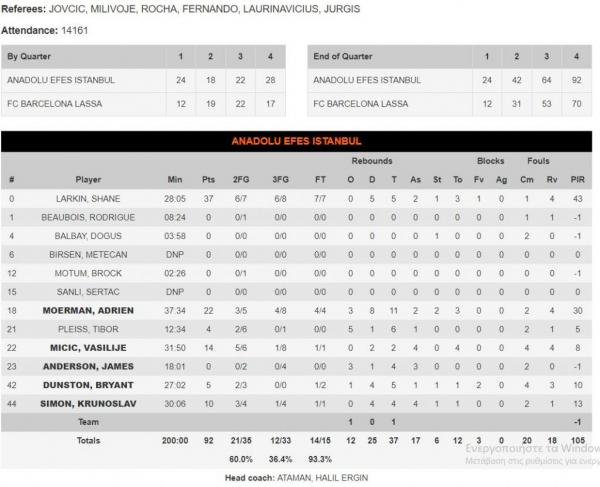 Οι Τούρκοι είχαν υψηλή ευστοχία σε δίποντα (21/35) και τρίποντα (12/33), κατέβασαν 12 επιθετικά ριμπάουντ, μοίρασαν 17 ασίστ και έκλεψαν 6 φορές τη μπάλα. Παράλληλα υποχρεώσαν τους αντιπάλους τους στο τραγικό 3/20 τρίποντα και έτσι το 22/36 δίποντα (61,1%) που είχαν οι Καταλανοί δεν τους πλήγωσε.